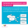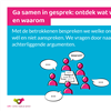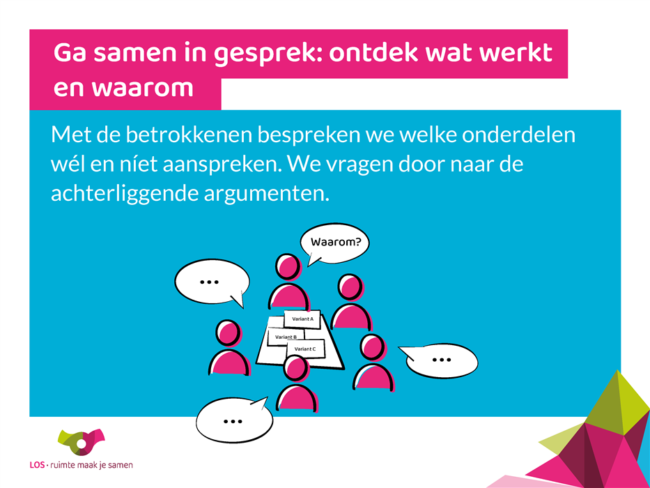 - In gesprek en ontdekken wat wel en niet aanspreekt en waarom. We leggen de varianten voor aan betrokkenen. We vragen hen niet naar een voorkeursvariant maar naar de argumenten voor en tegen per variant. Wat spreekt wel en niet aan per variant en waarom. Niet alleen aandacht voor de tegens maar ook de argumenten voor halen we op. Meningen alleen zijn niet relevant, het gaat altijd om de argumenten daarachter. Deze worden verzameld en gedocumenteerd.