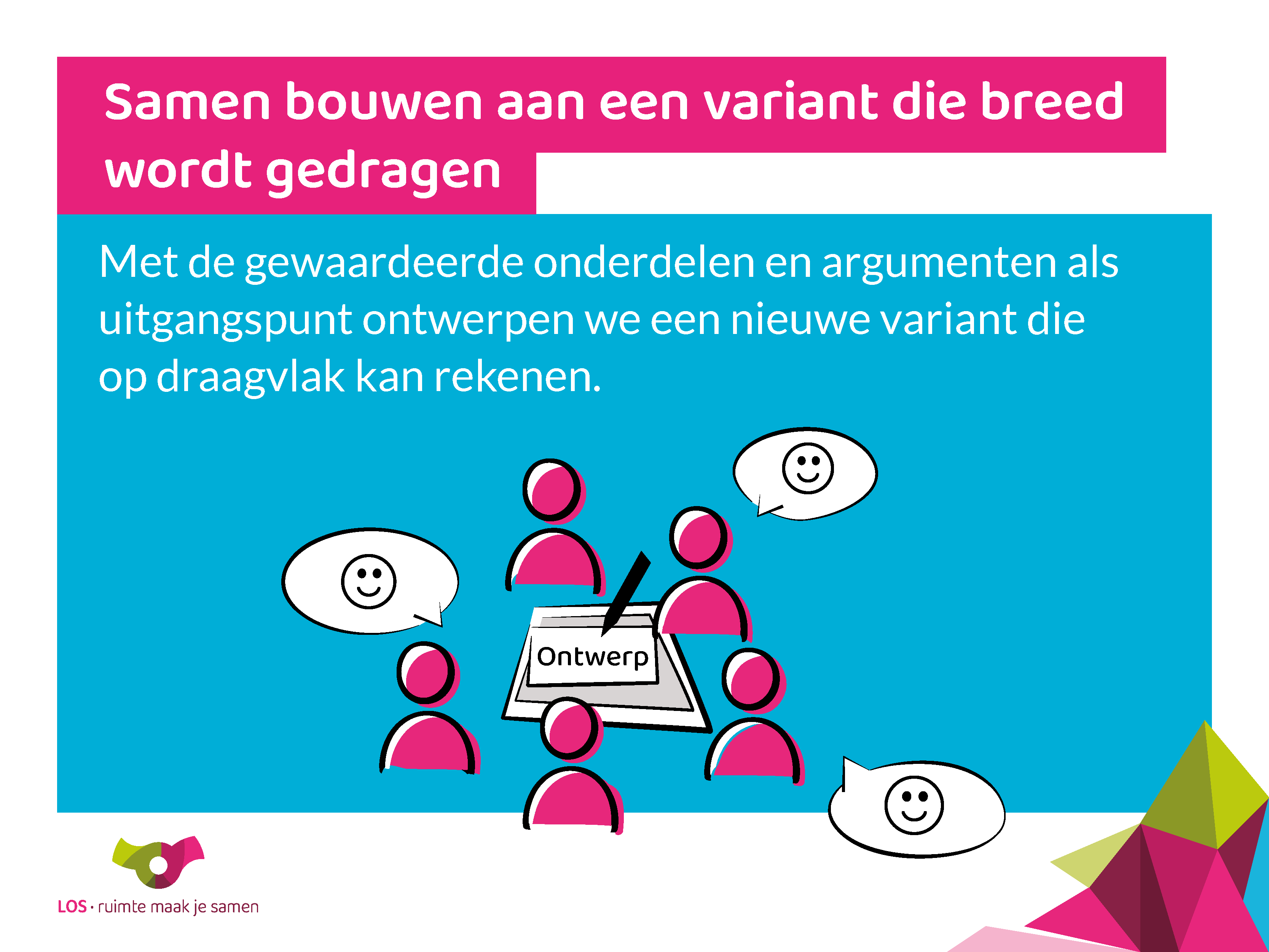 - Verwerken tot een nieuwe variant die op draagvlak kan rekenen. Op basis van de gewaardeerde onderdelen en argumenten ontwerpen we een nieuwe variant die meestal bestaat uit een integratie van onderdelen per variant die het best scoorden. We werken de voorkeursvariant uit met de opgehaalde argumenten als basis. We lichten de uitgewerkt voorkeursvariant toe en laten zien hoe deze tot stand is gekomen op basis van de eerder opgehaalde argumenten. Zo is voor iedereen duidelijk welke keuzes zijn gemaakt en waarom.