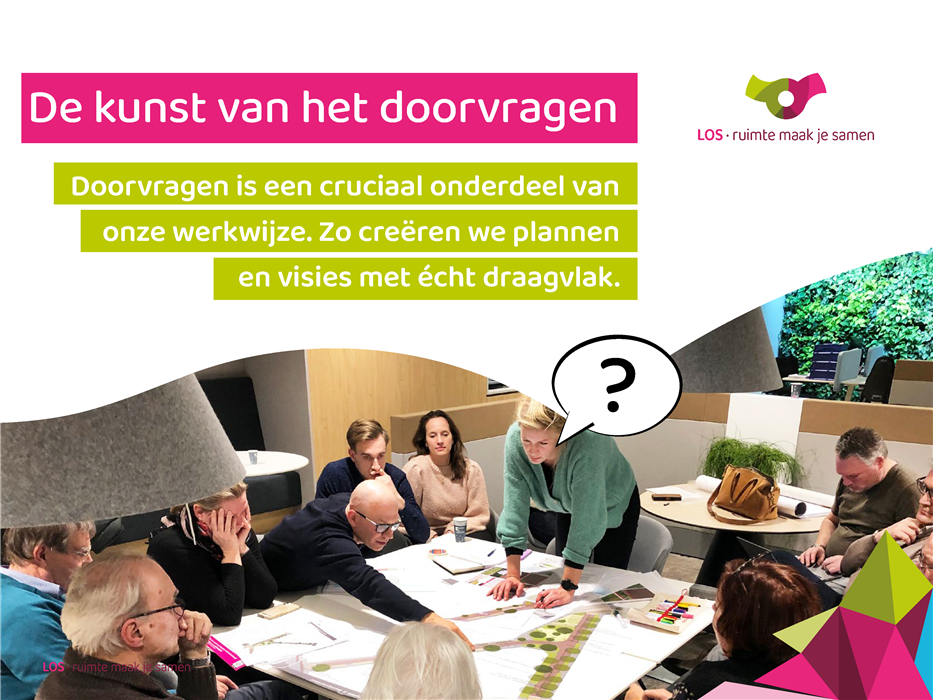 Hoe kom je tot een breed gedragen plan of visie terwijl belangen en meningen uiteenlopen? Vaak zit achter elk stevig standpunt een wereld van genuanceerde argumenten, ervaringen, idealen en ideeën. Het is de kunst om deze boven tafel te krijgen en te gebruiken als bouwstenen in het planvormingsproces. Daarbij is doorvragen een essentieel onderdeel van onze werkwijze om tot breed gedragen plannen en visies te komen.