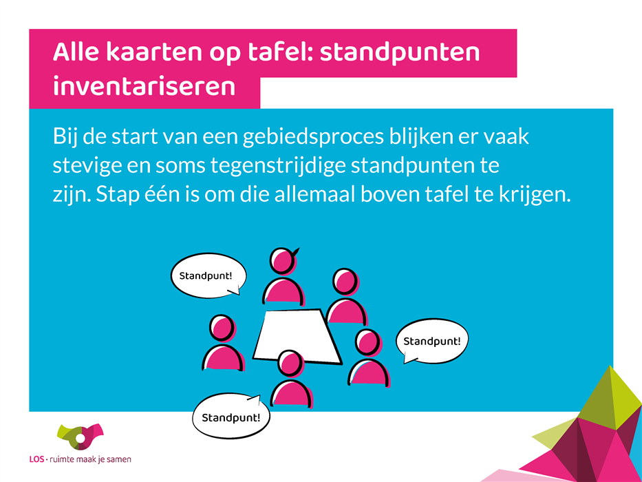 - Alle kaarten op tafel: standpunten inventariseren. Bij de start van een gebiedsproces blijken er vaak stevig en soms tegenstrijdige standpunten te zijn. Stap één is om deze allemaal boven tafel te krijgen. Belangrijk is om een zo goed mogelijke afspiegeling van alle belangen en betrokkenen te bereiken en te betrekken. Direct omwonenden en belangenverenigingen zijn vaak wel aanwezig bij bijeenkomsten. We maken uitnodigingen die bijvoorbeeld ook jongeren en mogelijk toekomstige bewoners oproepen om mee te denken.