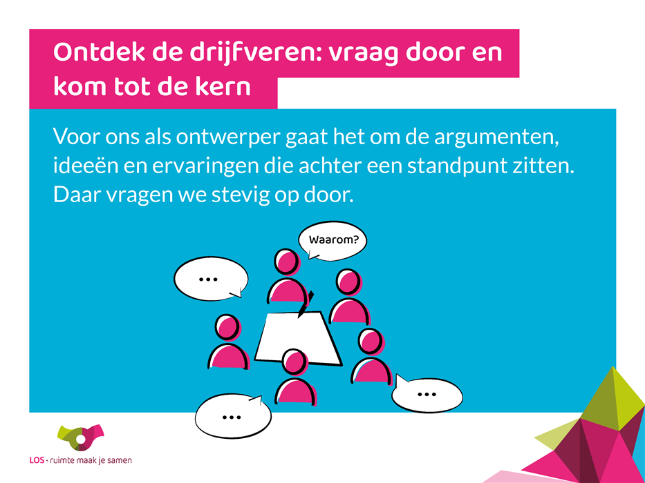 - Ontdekken van de drijfveren en doorvragen om tot de kern te komen. Voor ons als ontwerper gaat het vooral om de argumenten, ideeën en ervaringen die achter een standpunt zitten. Daar vragen we stevig op door. Dat doen we in gespreksvormen waarin iedereen de ruimte krijgt om een standpunt in te brengen en vooral ook dat uit te leggen. Bijvoorbeeld door kleine flexibele gespreksvormen zoals themahoeken, inloopavonden, online enquêtes. We vragen door naar de achterliggende argumenten waarom iemand iets vindt. Het kan gaan om eerdere ervaringen, idealen of andere overwegingen die aan de basis staan van het standpunt.