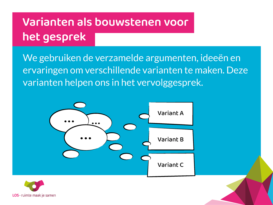 - Varianten als bouwstenen voor het gesprek. We documenteren de opgehaalde argumenten, ideeën en ervaringen goed. Vervolgens maken we een analyse met een onderscheid in relevante en minder relevante argumenten. In een creatieve stap maken we een aantal ruimtelijke varianten op basis van de opbrengst.